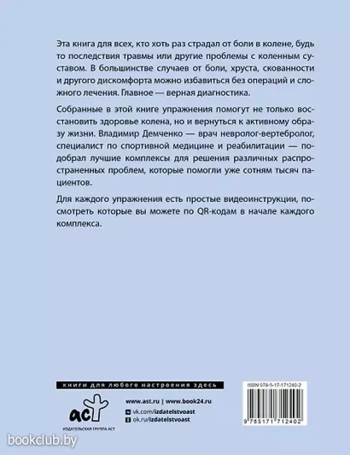 Собранные в этой книге упражнения помогут не только восстановить здоровье колена, но и вернуться к активному образу жизни. Владимир Демченко — врач невролог-вертебролог, специалист по спортивной медицине и реабилитации — подобрал лучшие комплексы для решения различных распространенных проблем, которые помогли уже сотням тысяч пациентов.