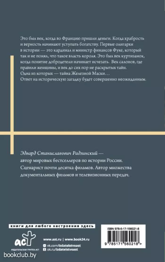 Это был век, когда во Францию пришли деньги. Когда храбрость и верность начинают уступать богатству. Первые олигархи в истории - это кардинал и министр финансов Фуке, который так и не понял, что такой власть короля. Это был век куртизанок, когда понятие добродетели начинает исчезать. Век салонов, где правили женщины, и век до сих пор не раскрытых тайн. Одна из которых - тайна Железной Маски… Ответ на историческую загадку будет совершенно неожиданным.