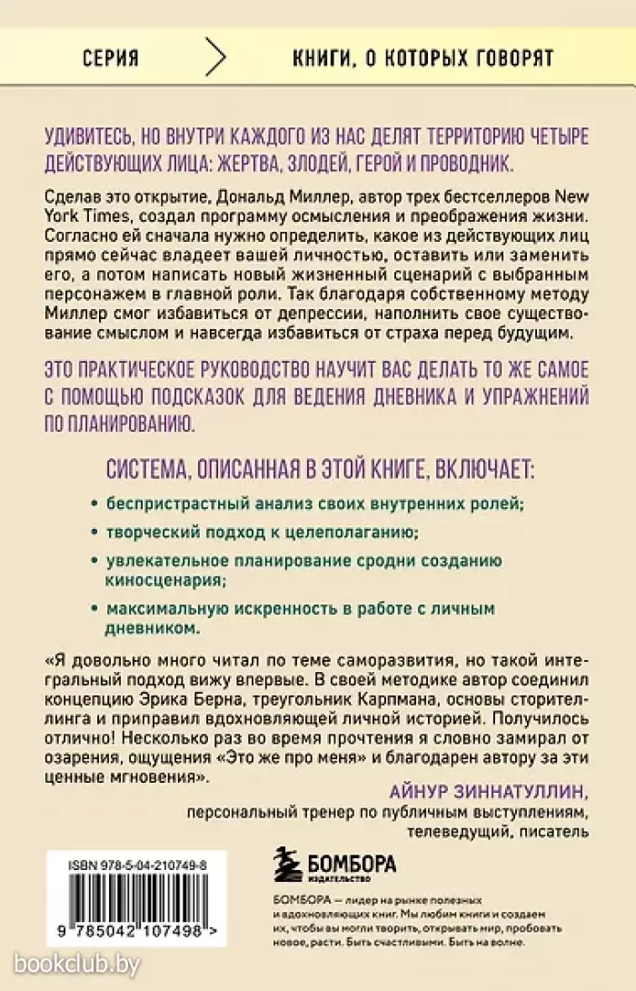 «Я довольно много читал по теме саморазвития, но такой интегральный подход вижу впервые. В своей методике автор соединил концепцию Эрика Берна, треугольник Карпмана, основы сторителлинга и приправил вдохновляющей личной историей. Получилось отлично! Несколько раз во время прочтения я словно замирал от озарения, ощущения "Это же про меня" и благодарен автору за эти ценные мгновения». — Айнур Зиннатуллин, персональный тренер по публичным выступлениям, телеведущий, писатель