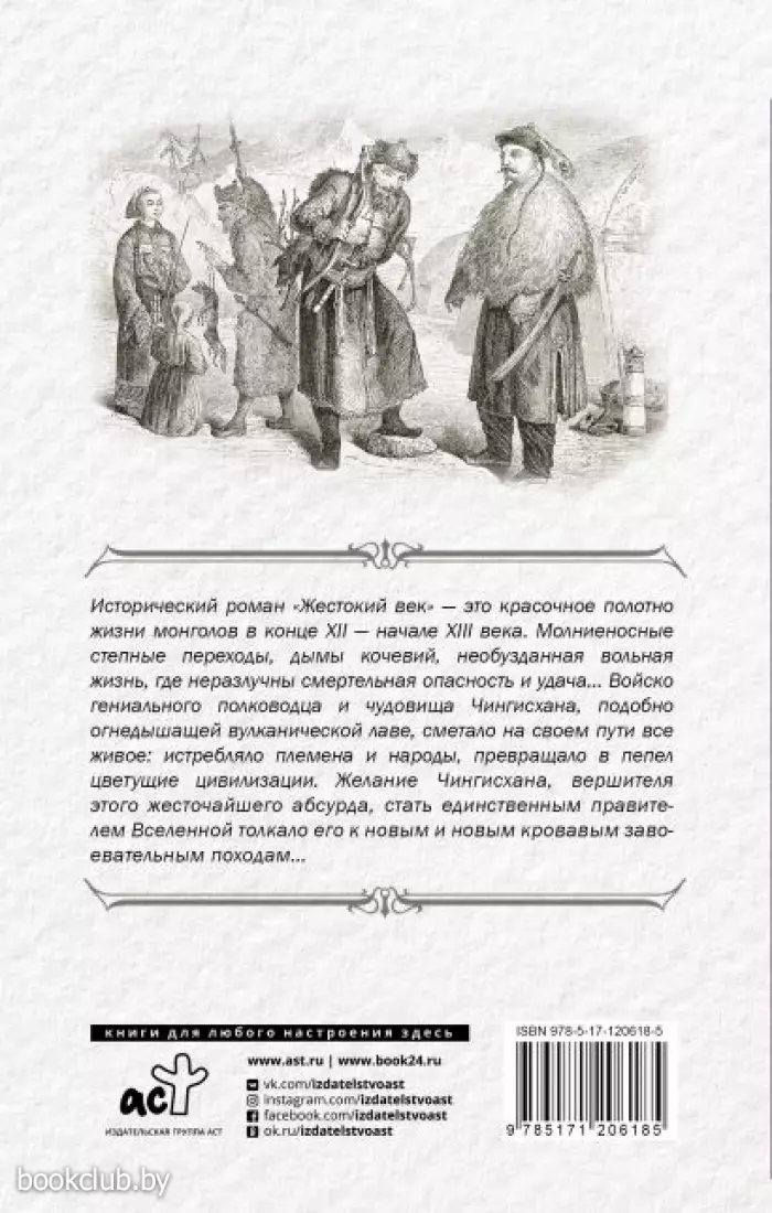 Исторический роман "Жестокий век" – это красочное полотно жизни монголов в конце ХII – начале XIII века. Молниеносные степные переходы, дымы кочевий, необузданная вольная жизнь, где неразлучны смертельная опасность и удача… Войско гениального полководца и чудовища Чингисхана, подобно огнедышащей вулканической лаве, сметало на своем пути все живое: истребляло племена и народы, превращало в пепел цветущие цивилизации. Желание Чингисхана, вершителя этого жесточайшего абсурда, стать единственным правителем Вселенной, толкало его к новым и новым кровавым завоевательным походам…