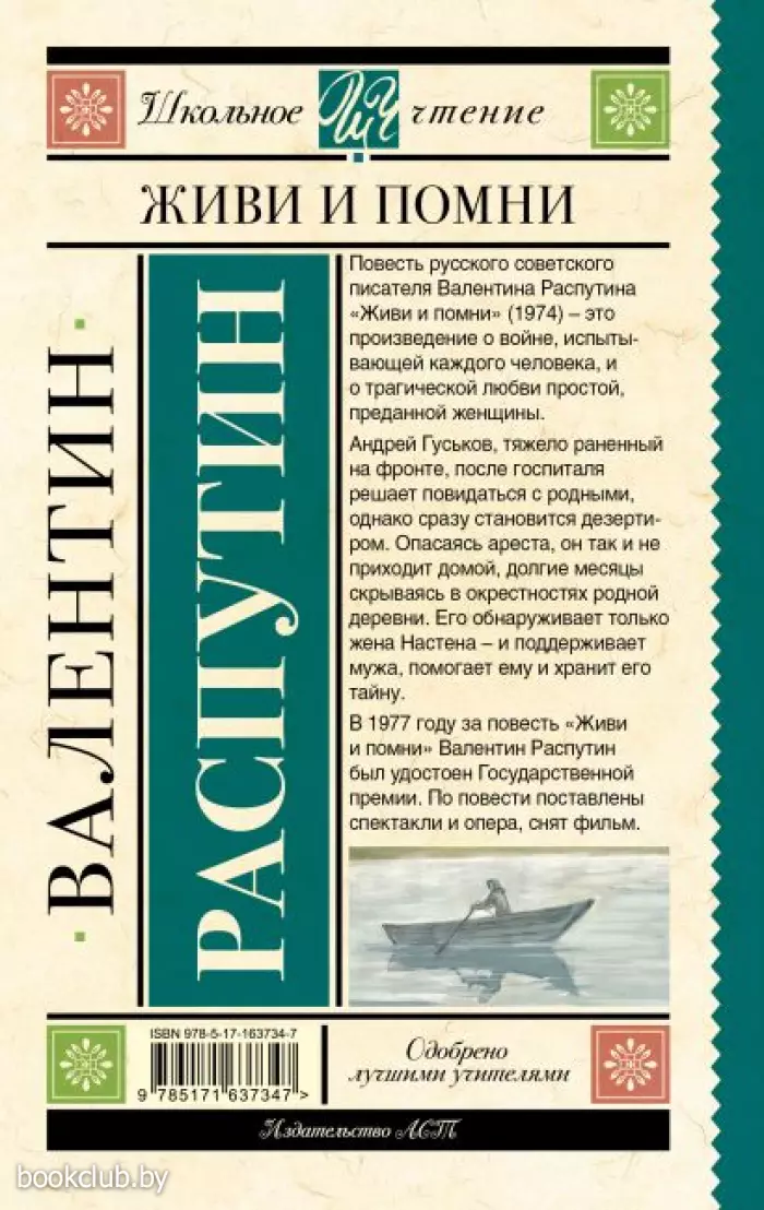 В 1977 году за повесть "Живи и помни" Валентин Распутин был удостоен Государственной премии. По повести поставлены спектакли и опера, снят фильм. Книги издательства «АСТ» из серии «Школьное чтение» станут прекрасным дополнением вашей библиотеки. Для вашего удобства при оформлении заказа по телефону назовите код товара: 403729