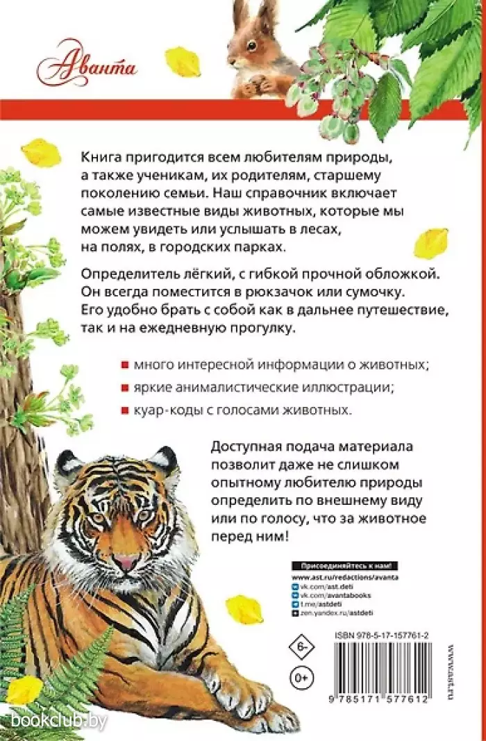 В книге вы найдете не только описания и изображения, но и голоса различных животных России. От известного всем ежа и суслика до тигра, от представителя отряда рукокрылых - рыжей вечерницы до косатки и бутылконосого дельфина – афалины, от волка и енотовидной собаки до бурого медведя… Мурлыканье, писк, рев, ржанье, щелчки – самые разнообразные "песни" и "разговоры" животных услышат читатели с помощью куар-кодов, представленных в нашем определителе.