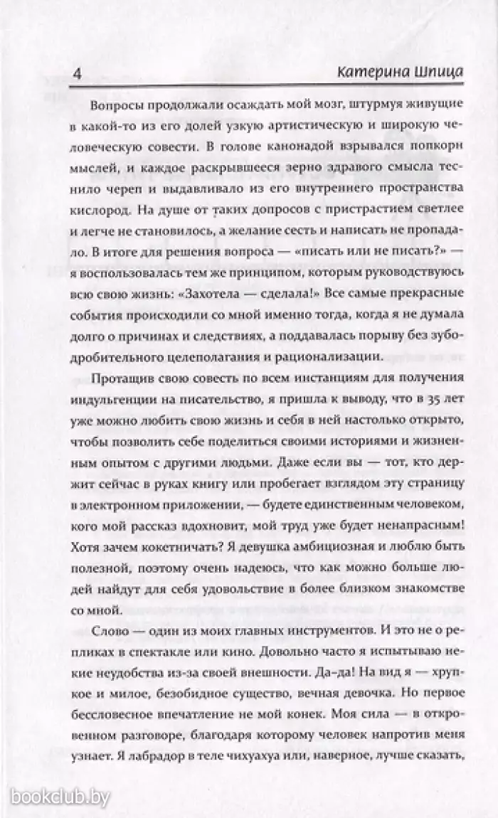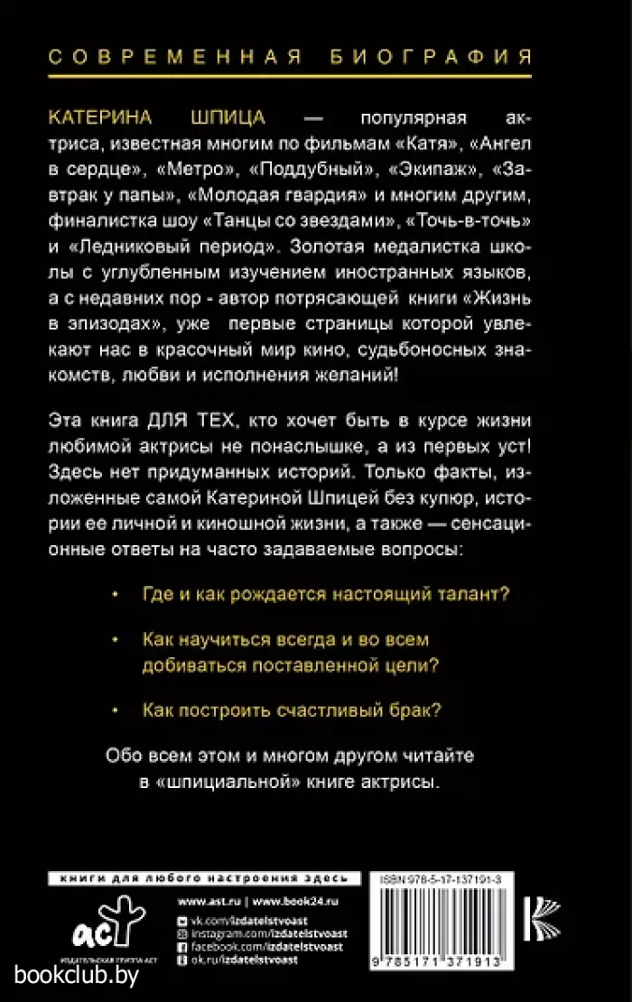 Эта книга ДЛЯ ТЕХ, кто хочет быть в курсе жизни любимой актрисы не понаслышке, а из первых уст! Здесь нет придуманных историй. Только факты, изложенные самой Катериной Шпицей без купюр, истории ее личной и киношной жизни, а также – сенсационные ответы на часто задаваемые вопросы: