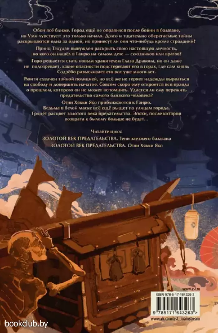 Обон всё ближе. Город ещё не оправился после бойни в балагане, но Уми чувствует: это только начало. Долго и тщательно оберегаемые тайны раскрываются одна за одной, но принесут ли они что-нибудь кроме страданий? Принц Тэцудзи вынужден раскрыть свою настоящую личность, но кого он нашёл в Ганрю на самом деле — союзников или врагов? Горо решается стать новым хранителем Глаза Дракона, но он даже не подозревает, какие опасности подстерегают его в горах, где сам князь Содзёбо разыскивает его вот уже много лет. Рюити схвачен тайной полицией, но всё же не теряет надежды вырваться на свободу и довершить начатое. Совсем скоро ему откроется вся правда о прошлом, которого он не может вспомнить. Удастся ли ему пережить предательство самого близкого человека? Огни Хякки Яко приближаются к Ганрю. Ведьма в белой маске всё ещё рыщет по улицам города. Грядёт расцвет золотого века предательства. Эпохи, после которой возврата к былому больше не будет…
