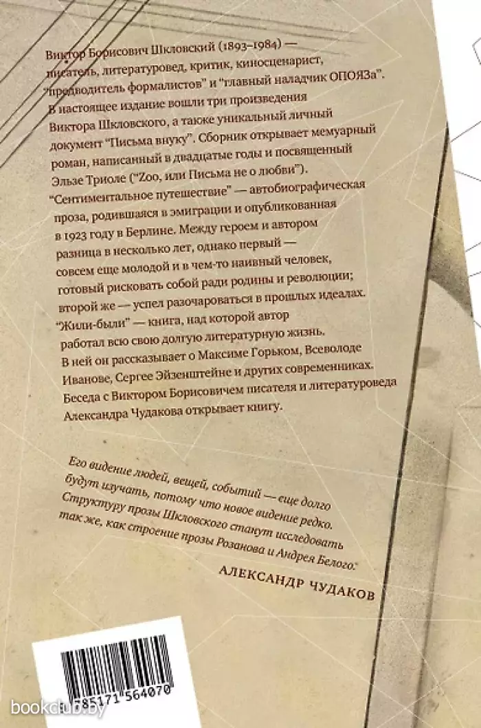 Виктор Борисович Шкловский (1893–1984) — писатель, литературовед, критик, киносценарист, “предводитель формалистов” и “главный наладчик ОПОЯЗа”. В настоящее издание вошли три произведения Виктора Шкловского, а также уникальный личный документ “Письма внуку”. Сборник открывает мемуарный роман, написанный в двадцатые годы и посвященный Эльзе Триоле (“Zoo, или Письма не о любви”). “Сентиментальное путешествие” — автобиографическая проза, родившаяся в эмиграции и опубликованная в 1923 году в Берлине. Между героем и автором разница в несколько лет, однако первый — совсем еще молодой и в чем-то наивный человек, готовый рисковать собой ради родины и революции; второй же — успел разочароваться в прошлых идеалах. “Жили-были” — книга, над которой автор работал всю свою долгую литературную жизнь. В ней он рассказывает о Максиме Горьком, Всеволоде Иванове, Сергее Эйзенштейне и других современниках. Беседа с Виктором Борисовичем писателя и литературоведа Александра Чудакова открывает книгу. “Его видение людей, вещей, событий — еще долго будут изучать, потому что новое видение редко. Структуру прозы Шкловского станут исследовать так же, как строение прозы Розанова и Андрея Белого” (Александр Чудаков).