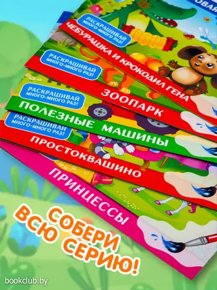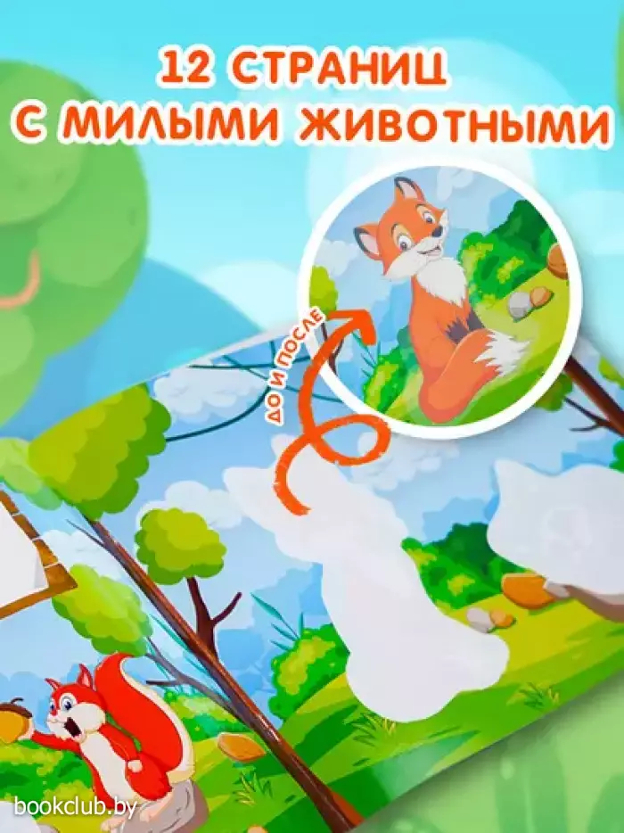 Это не обычная раскраска, а волшебная книжка.Проведёшь мокрой кисточкой по бумаге — и перед тобой яркая картинка. Когда вода высохнет, рисунок снова станет чёрно-белым, и его можно будет раскрашивать заново!