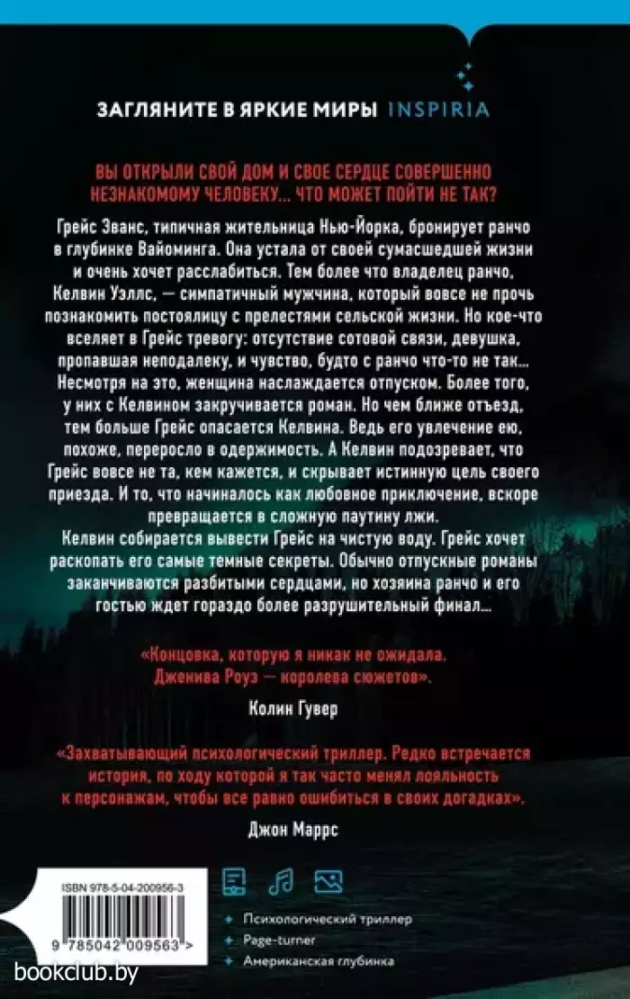 Грейс Эванс, типичная жительница Нью-Йорка, бронирует ранчо в глубинке Вайоминга. Она устала от своей сумасшедшей жизни и очень хочет расслабиться. Тем более, что владелец ранчо, Келвин Уэллс – симпатичный мужчина, который вовсе не прочь познакомить постоялицу с прелестями сельской жизни. Но кое-что вселяет в Грейс тревогу: отсутствие сотовой связи; девушка, пропавшая неподалеку; и чувство, будто с ранчо что-то не так… Несмотря на это, женщина наслаждается отпуском. Более того: у них с Келвином закручивается роман. Но чем ближе отъезд, тем больше Грейс опасается Келвина. Ведь его увлечение ею, похоже, переросло в одержимость. А Келвин подозревает, что Грейс вовсе не та, кем кажется, и скрывает истинную цель своего приезда. И то, что начиналось как любовное приключение, вскоре превращается в сложную паутину лжи. Келвин собирается вывести Грейс на чистую воду. Грейс хочет раскопать его самые темные секреты. Обычно отпускные романы заканчиваются разбитыми сердцами, но хозяина ранчо и его гостью ждет гораздо более разрушительный финал…