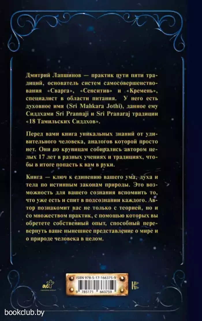 Дмитрий Лапшинов — практик пути пяти традиций, основатель систем самосовершенствования «Сварга», «Сенситив» и «Кремень», специалист в области питания. У него есть духовное имя (Sri Mahkara Jothi), данное ему Сиддхами Sri Prannaji и Sri Pranaraj традиции «18 Тамильских Сиддхов». Перед вами книга уникальных знаний от удивительного человека, аналогов которой просто нет. Они по крупицам собирались автором целых 17 лет в разных учениях и традициях, чтобы в итоге попасть к вам в руки. Книга — ключ к единению вашего ума, духа и тела по истинным законам природы. Это возможность для вашего сознания вспомнить то, что уже есть и спит в подсознании каждого. Автор познакомит вас не только с теорией, но и со множеством практик, с помощью которых вы обретете собственный опыт, способный перевернуть ваше нынешнее представление о мире и о природе человека в целом.