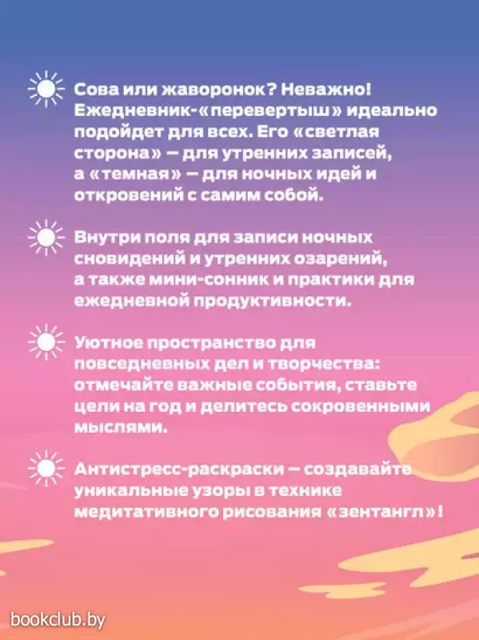 Ежедневник-перевертыш для записи утренних инсайтов, снов и ночных идей подойдет как людям-жавороникам, так и совам. Здесь вы найдете поля для записи ваших ночных сновидений и утренних озарений, а также небольшой сонник. Кроме того ежедневник содержит антистресс-раскраски и специальные поля для арт-терапии — создания уникальных узоров-зентанглов. Если у вас есть вопросы по данному товару, Вы всегда можете позвонить в нашу информационную службу (озвучив код товара: 409250) и наши сотрудники ответят на все интересующие вас вопросы.