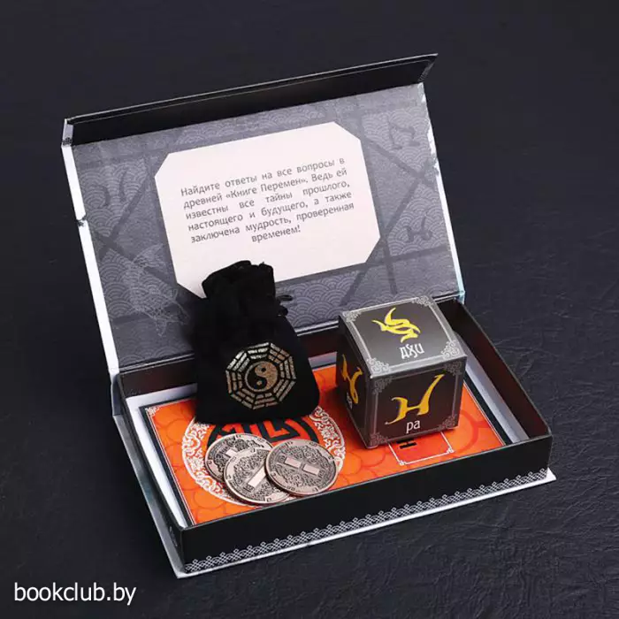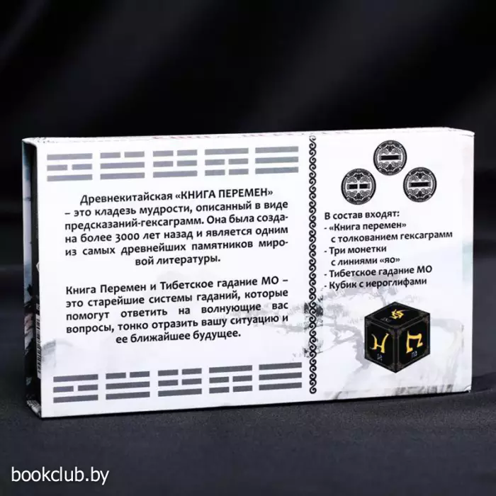 Древнекитайская Книга Перемен — книга-оракул, наполненная вековой мудростью. Обратившись к гаданию, вы непременно получите ответ, ведь этой книге известны все тайны прошлого, настоящего и будущего. В комплекте вы также найдете древнее тибетское гадание Мо. Сформулируйте вопрос и дважды подбросьте кубик. Посмотрите, какое сочетание слогов выпало, и читайте толкование.