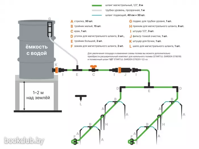 Система капельного полива ST601.30 предназначена для полива 30 растений на площади 6 кв. м или на грядку размером 6х1 м при посадке растений в 2 ряда. Дозированная подачи воды в прикорневую зону растений, требующих «теплого» полива (томат, огурец, перец, кабачок, тыква, баклажан). Применение: допускается использовать как в парниках или теплицах, так и для растений, выращиваемых в открытом грунте. Рабочее давление: 0,1-0,2 атм (обеспечивается установкой бочки на высоте 1-2 м от поверхности земли). Расход воды на одно растение ~ 4 л/ч. Расширение: для увеличения площади и изменения схемы полива дополнительно приобретается расширительный комплект для капельного полива от емкости на 20 растений STARTUL GARDEN (арт. ST6018) и поливочный шланг 1/2" STARTUL GARDEN серии ST620.1/2-ХХ. Для просверливания отверстия в емкости диаметром 22+1 мм рекомендуется для использования коронка биметаллическая d22 мм GEPARD (GP251.22). Упаковка: индивидуальная картонная коробка. Наша компания работает только с проверенными поставщиками и брендами, поэтому вы делаете правильный выбор. Для вашего удобства при оформлении заказа по телефону назовите код товара: