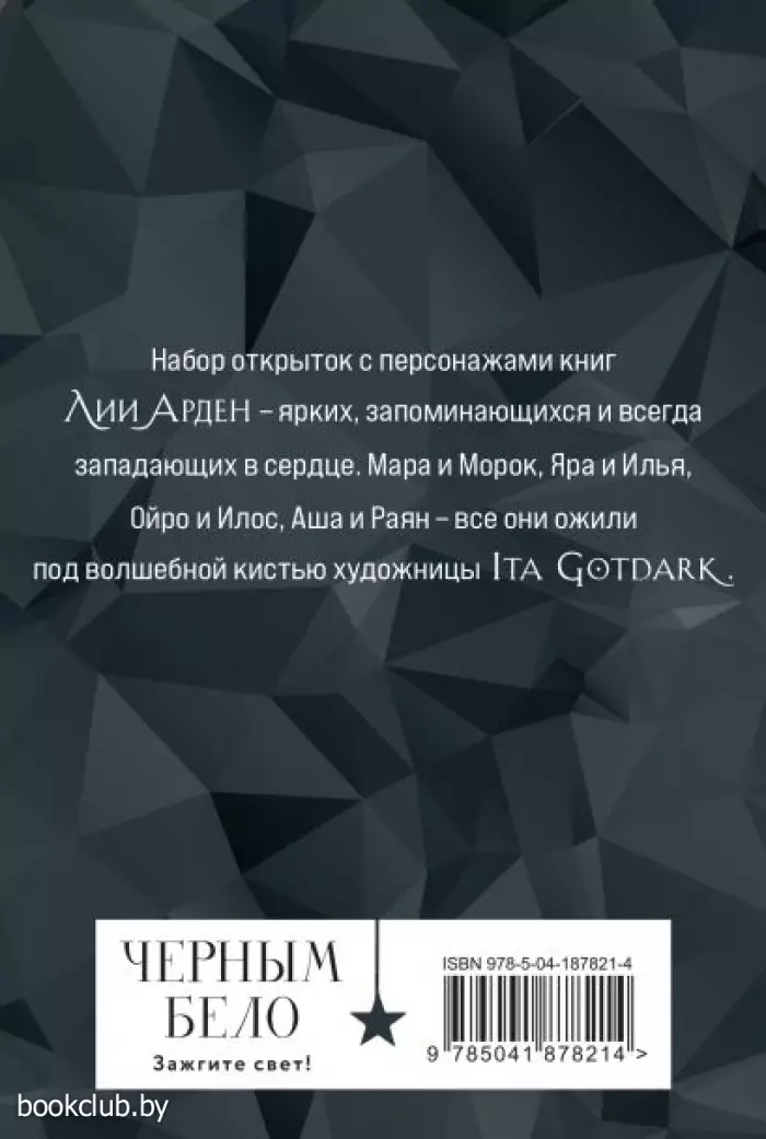 Набор открыток с персонажами книг Лии Арден — ярких, запоминающихся и всегда западающих в сердце. Мара и Морок, Яра и Илья, Ойро и Илос, Аша и Раян — все они ожили под волшебной кистью художницы Ita Gotdark.