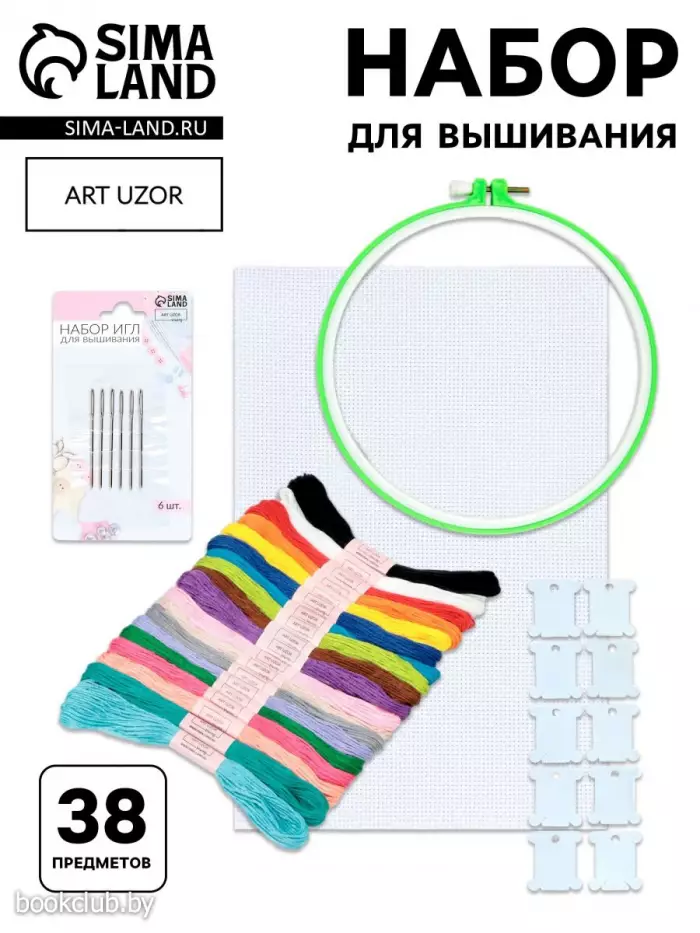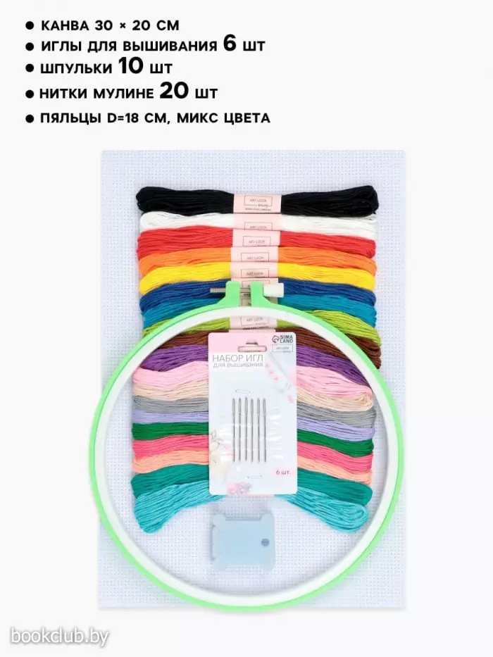 Комплектация: • канва (30х20 см, белая); • пластиковые пяльцы (d=18 см); • шпульки пластиковые (3,6х4 см, 10 шт. ); • набор игл для вышивания № 2 (d=0,94 мм, длина иглы 40,5 мм, 6 шт. ); • нитки мулине (ТМ «Арт Узор» , 20 шт. , номера цветов: BLANC, 310,666.796,909.307,740.827,3837.435,415.605,955.739,816.155,336.3341,938.906).